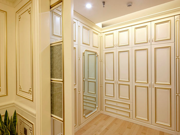 采用标准化机械生产,专业设计师上门测量设计后,对尺寸把握比较精确,全自动机器封边保证了整体衣柜的密合度及精细度的高质量,大大提高了使用年限。结合科技元素,充分体现定制衣柜的风格多样化。
